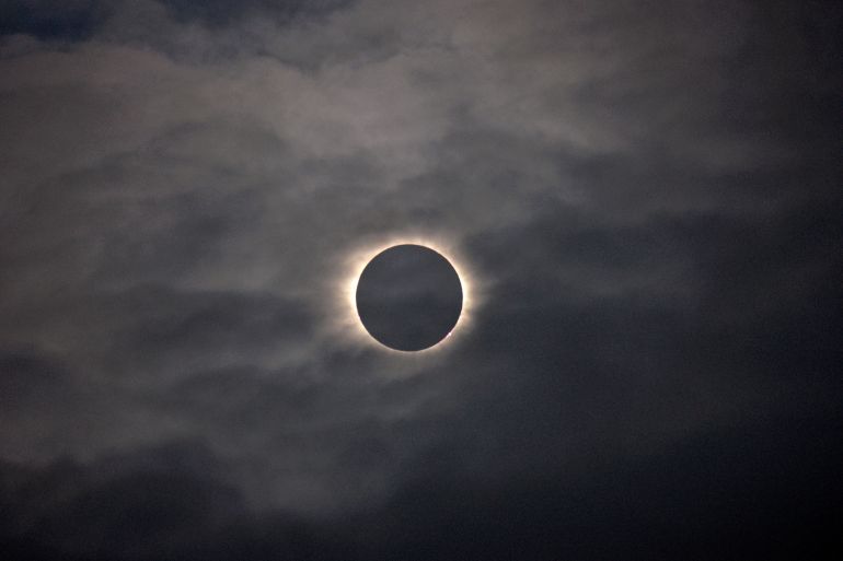 As the moon moves past the sun during an eclipse, it will slowly obscure the sun – creating a dark sky – before reaching the moment of “totality”. That’s when almost the entirety of the sun will be covered, leaving only a faint circle of the sun’s light or the corona.