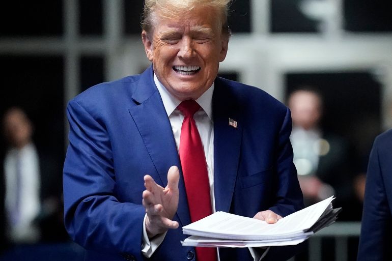 With Friday’s hearing finally at an end, Trump exited the courtroom and spoke to the press, denouncing the prosecution’s case as a “scam”.
