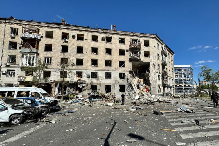 Syniehubov said rescue work is proceeding. Other civilian targets were also hit and public transport halted. Mayor Ihor Terekhov said there had been four strikes.