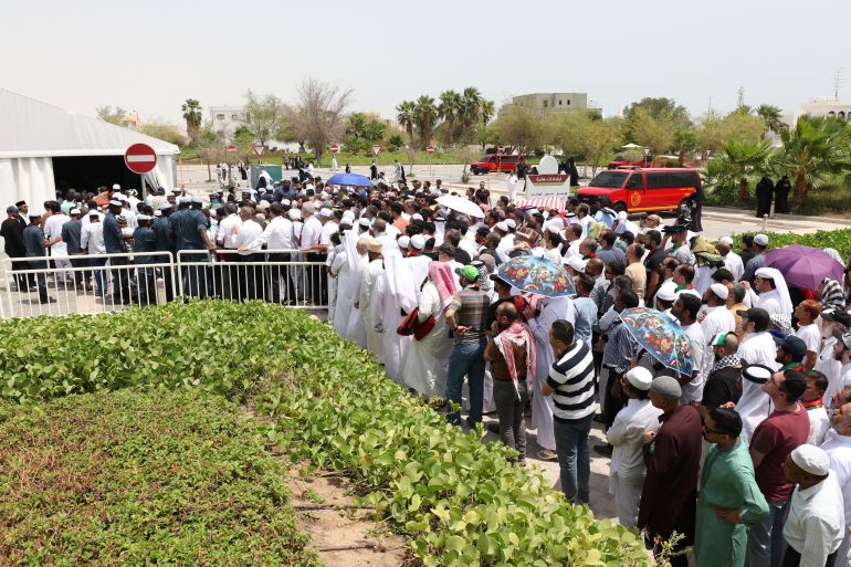 Men and women, many of them wearing the keffiyeh, the traditional Palestinian scarf, and carrying Palestinian flags, came to attend the funeral prayers despite Doha’s punishing heat, which hovered around 45 degrees Celsius (113 degrees Fahrenheit).