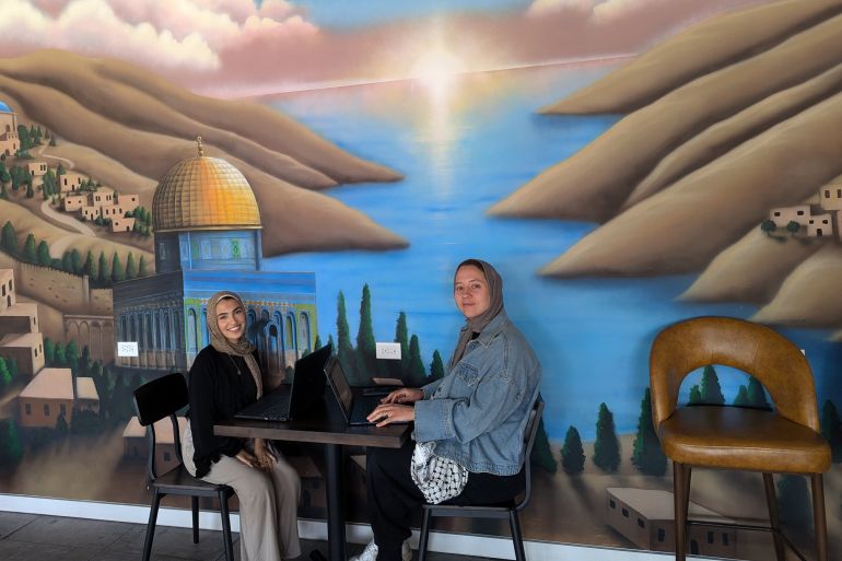 At the cafe, there were several paintings related to the war, including depictions of Palestinian victims such as Hind Rajab, the six-year-old girl who was stranded in her family’s car and gunned down by Israeli tank fire before rescuers were able to reach her.