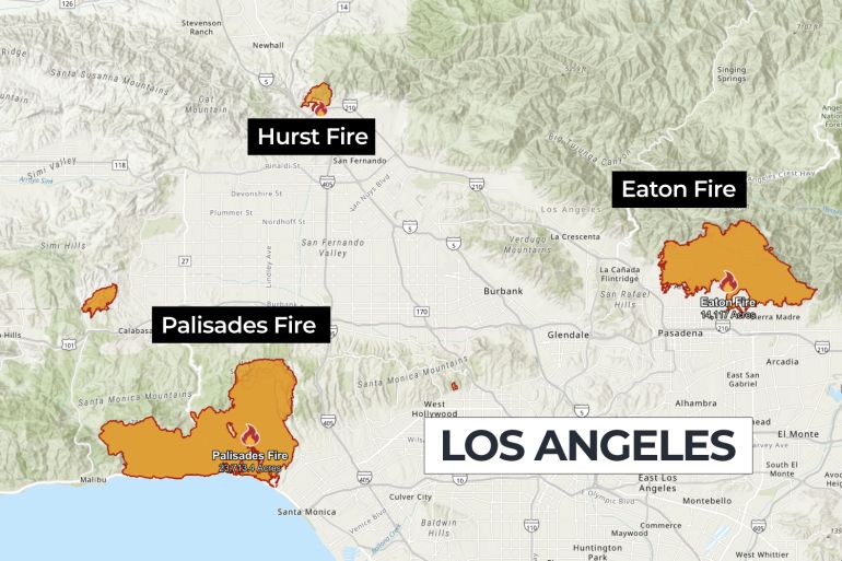 About 40km (25 miles) to the east, the Eaton fire also engulfed large parts of the Altadena area, destroying more than 5,000 structures.