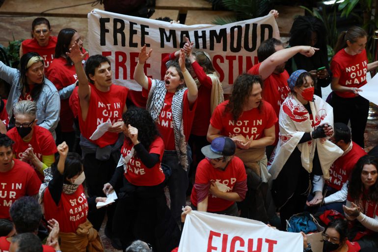 Demonstrators have flooded the lobby of Trump Tower in New York City, in a show of solidarity with student protest leader Mahmoud Khalil, a permanent resident of the United States.