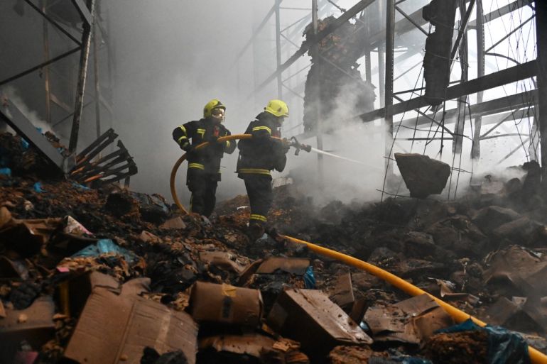 ![Ukrainian rescuers work to extinguish a fire in a food warehouse following a drone attack in Kharkiv on April 14, 2025 [Sergey Bobok/AFP]](https://www.aljazeera.com/wp-content/uploads/2025/04/000_429F8GD-1744639897.jpg?resize=770%2C513&quality=80)