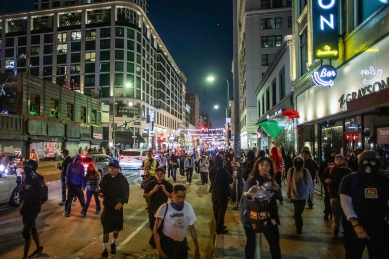 On Tuesday evening, the Los Angeles Police Department (LAPD) imposed a curfew in the city’s downtown and announced that they would carry out “mass arrests” if people gathered in the designated curfew area. The curfew lasted until 6am (13:00 GMT) on Wednesday.