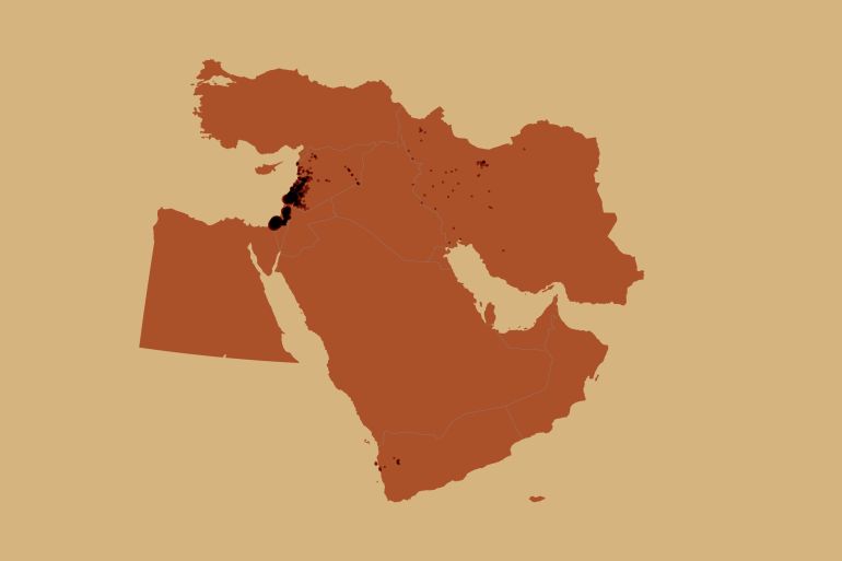 The map below shows the locations and quantity of Israeli attacks carried out between October 7, 2023, and June 13, 2025, in five countries up to 2,000km (1,200 miles) away.