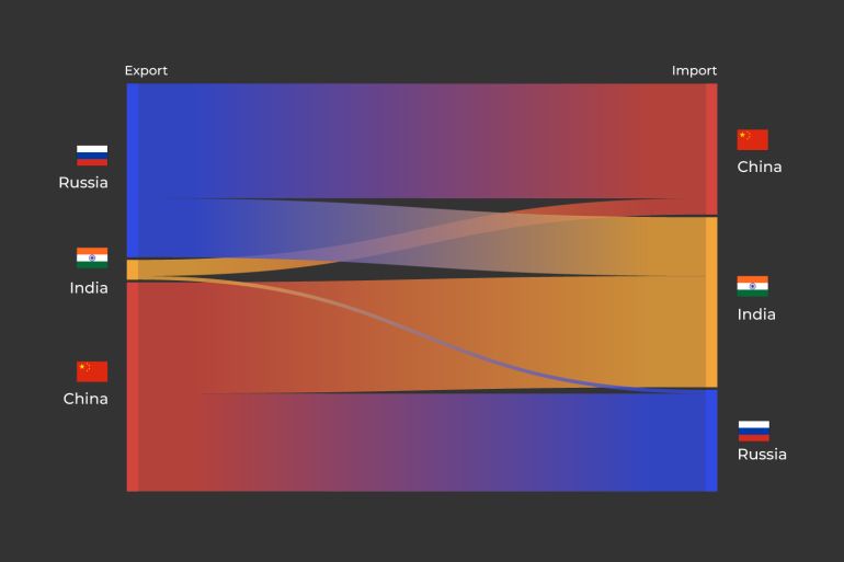 Trilateral trade between China, India and Russia accounted for $452bn in 2023, up from $351bn in 2022, according to the Observatory of Economic Complexity (OEC).