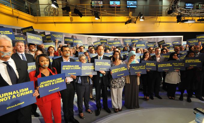 Journalists gather for global day of action calling on Egypt to release staff arrested for practising journalism.