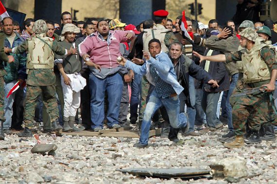 | Egyptian pro-democracy demonstrators battle regime loyalists (unseen) in Cairo’s Tahrir square [AFP] |