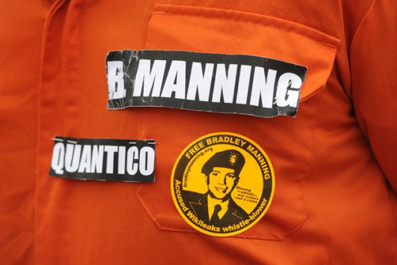 | Protesters gather to support Bradley Manning outside the Quantico base where he is being held in solitary confinement. As Manning endures his incarceration, political and military leaders accused of war crimes walk free [EPA] |