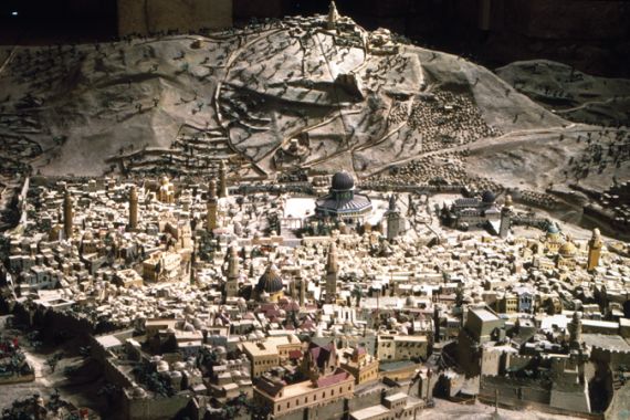 Night after night, Illés and his two assistants cut, melted and shaped beaten zinc (at the scale of 1:500), then painted thousands of pieces to simulate the natural and built topography of the city. Pastel paint suggested Jerusalem stone; subtle shifts in tone gave the effect of luminous shadow on buildings. The large scale model offers rare and revealing insights into the material reality of the city that Arab speakers call al-Quds al-Sharif.