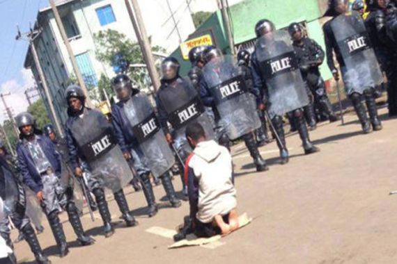 On August 8, 2013 – far from China’s Tiananmen Square, in Ethiopia’s capital Addis Ababa, a lone worshiper prayed the Eid Salat and was encircled by an army of riot police. The image shows a man on his knees praying unintimidated as a phalange of soldiers, bearing shields and batons, looked on. The desolate background, apparently deserted by other worshipers fearful for their lives or carted away, against an array of uniform police magnifies the image of this unknown rebel. Asked to name the faithful in the picture, Dimtsachin Yisema, the Facebook group often seen as the de facto leading body of the horizontal Ethiopian Muslims movement, said in an email, “it was sent to us by an activist.”