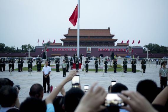 The square has been off-limits at night and there are airport security-type checks at all entrances. Some 150 armoured vehicles with SWAT teams have been patrolling Beijing’s streets since mid-May, recently joined by 650 police dogs and 850,000 volunteers. These volunteers are mostly elderly ladies with red arm bands, dubbed in the Chinese media as “anti-terrorism Big Mamas”. China has become a police state and a theatre of the absurd.