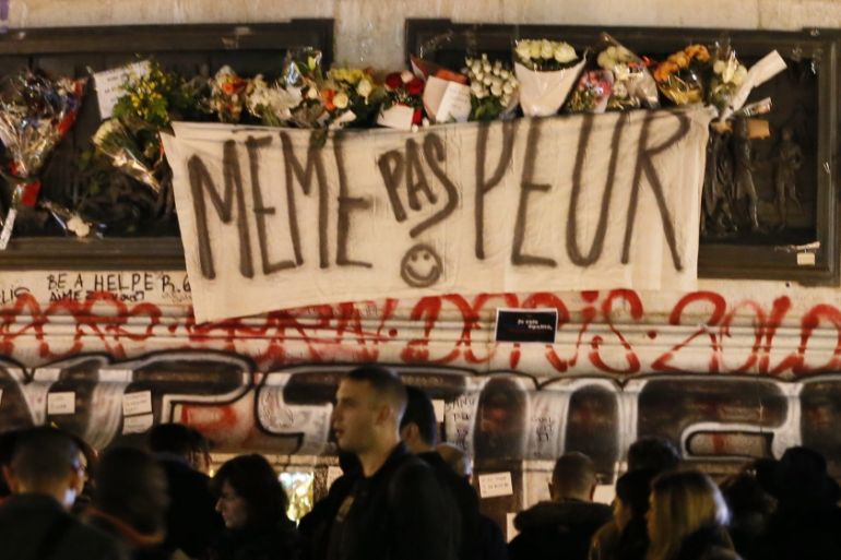 ![A sign reads ''Not even afraid'', draped on the statue on Place de la Republique in Paris, France [EPA]](https://www.aljazeera.com/wp-content/uploads/2015/11/fbe18f2d12624132881d4c7898926365_18.jpeg?resize=770%2C513&quality=80)