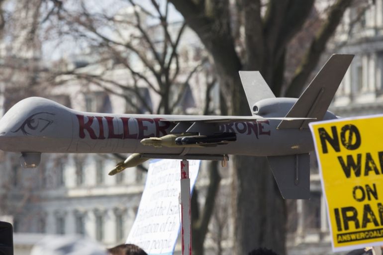 ![Protesters carry placards near a fake drone in front of the White House during an anti-war march in Washington, DC [AFP]](https://www.aljazeera.com/wp-content/uploads/2015/03/c2a421e1586344f2919834eb23d83ccf_18.jpeg?resize=770%2C513&quality=80)