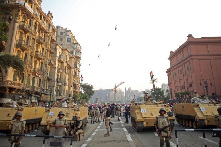 ![Egyptian military helicopters fly overhead as army soldiers stand guard at an entrance to Tahrir Square, in Cairo, Egypt [AP]](https://www.aljazeera.com/wp-content/uploads/2015/04/d2db45d3cc414e1b8395e34d19872146_18.jpeg?resize=770%2C513&quality=80)