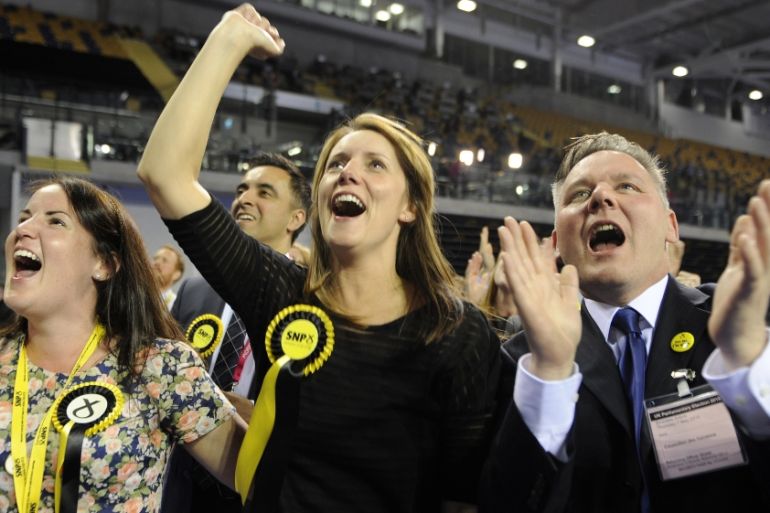 ![Scottish National Party supporters react to election results at the Glasgow election count in Glasgow [AFP]](https://www.aljazeera.com/wp-content/uploads/2015/05/ac5f0fa385404efb98d7800e1486f412_18.jpeg?resize=770%2C513&quality=80)
