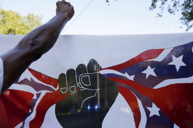 ![Demonstrators carry a flag showing a black fist closing around the confederate flag [REUTERS]](https://www.aljazeera.com/wp-content/uploads/2015/06/e35b9fce64dc488590b74230f3a84c0c_18.jpeg?resize=770%2C513&quality=80)