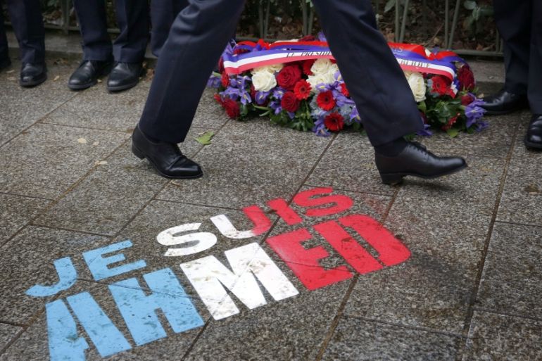 ![Policemen walk past spray painted on the sidewalk reading: "Je suis Ahmed," in the red, white and blue of the French flag near a plaque commemorating late police officer Ahmed Merabet in Paris [AP]](https://www.aljazeera.com/wp-content/uploads/2016/01/73fa0ff60d1d4825bb591931fddfeee2_18.jpeg?resize=770%2C513&quality=80)