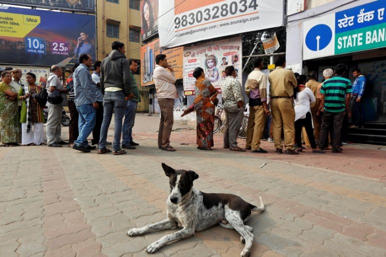 A stray dog rests as people queue outside an ATM to withdraw cash in Kolkata