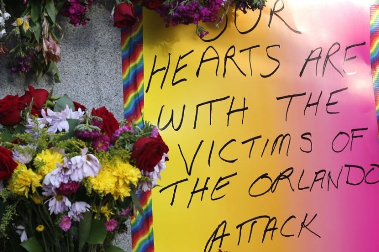 ![Residents of San Francisco and the Bay Area lay flowers and supporting messages as they gather to mourn the victims of a mass shooting at a LGBT nightclub in Orlando, Florida [EPA]](https://www.aljazeera.com/wp-content/uploads/2016/06/ddcef96bad07441694c77ea6bf8be73b_18.jpeg?resize=770%2C513&quality=80)