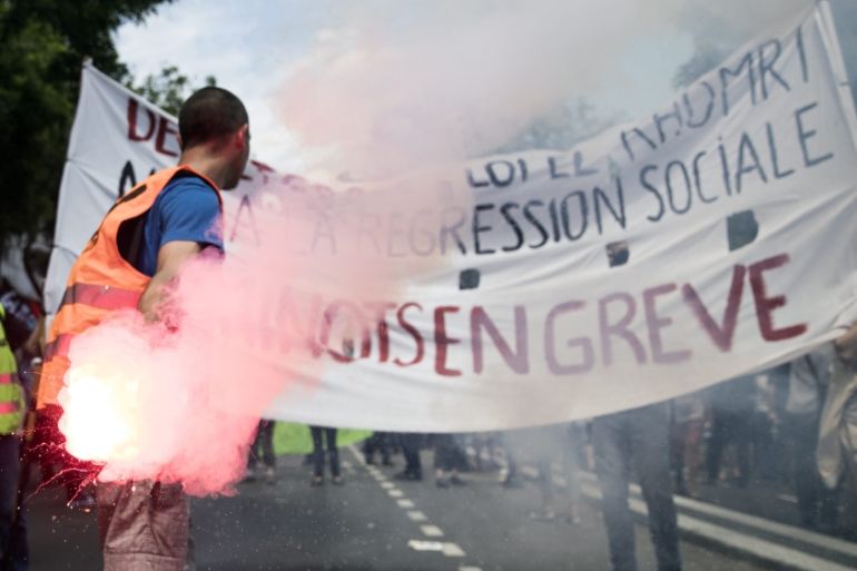 ![A protester holds a flare in front of a banner reading ''Railroad workers on strike'' during a national demonstration against the Labour Law reform in Paris, France [EPA]](https://www.aljazeera.com/wp-content/uploads/2016/06/b043d106e9f742d18d1ca3dfbcd7d830_18.jpeg?resize=770%2C513&quality=80)