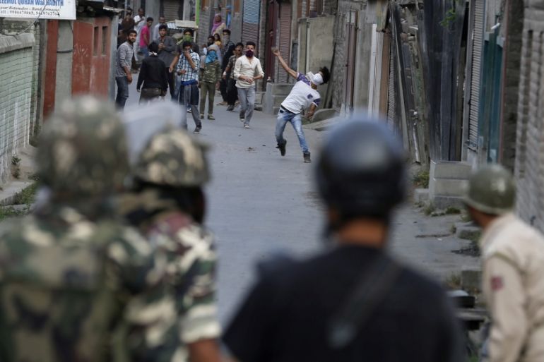 ![Kashmiri Muslim protesters throw stones at Indian police and paramilitary soldiers during clashes in Srinagar, capital of Indian Kashmir, on July 16 [EPA]](https://www.aljazeera.com/wp-content/uploads/2016/07/1ff86a64e5f041649997ebc5c5106ebf_18.jpeg?quality=80)
