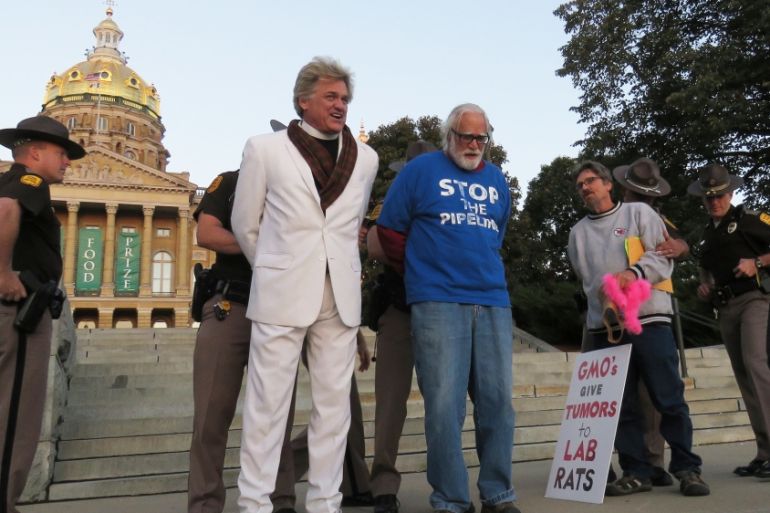 Iowa Governor Terry Branstad endorsed Trump, and now will be the new ambassador to China. Monsanto will like that. The World Food Prize party, where we were protesting – local wags call it “Monsanto’s Oscars”, has been subsidised by Iowa taxpayers up to $1m annually and features big cash awards to GMO advocates. Monsanto got Iowans to pay for their poison. The party’s location says it all: They rent the entire Iowa State Capitol building.