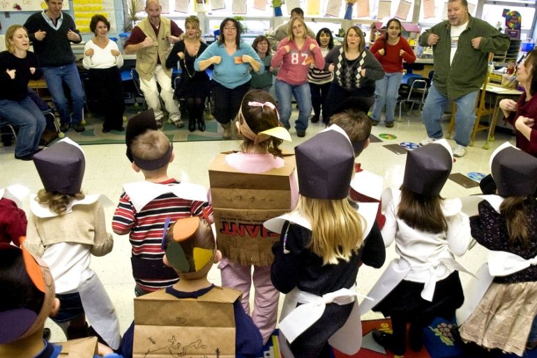 ![Native Americans are depicted at the first Thanksgiving feast, in a scene from a 1960 educational film about the Pilgrims’ first year in America [AP]](https://www.aljazeera.com/wp-content/uploads/2017/11/519ae8f7ba8c4efea3c2c4f5ee85abb8_6.jpeg?quality=80)