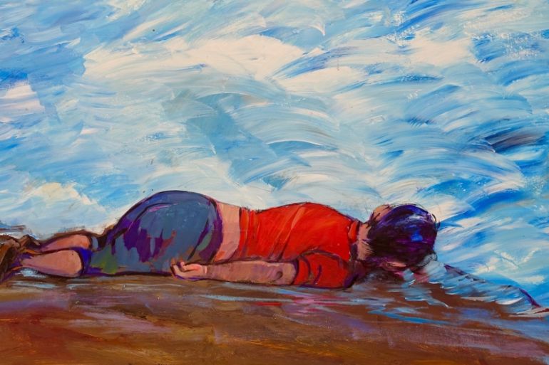 There are artworks that fall completely out of any of these easy attempts to categorise. Muhammad Ansi’s “Untitled (Alan Kurdi)” is clearly a painful contemplation of the three-year-old Syrian boy who drowned, almost within reach of the Greek island of Kos, in September 2015. The boy’s back is turned to us, the viewers, as it was in news photographs. The brilliant red of his shirt stands stark against the blue half-saucers of sea waves, which, through Ansi’s paint-strokes, also become as light as the sky – the heaven to which this child’s soul departed.