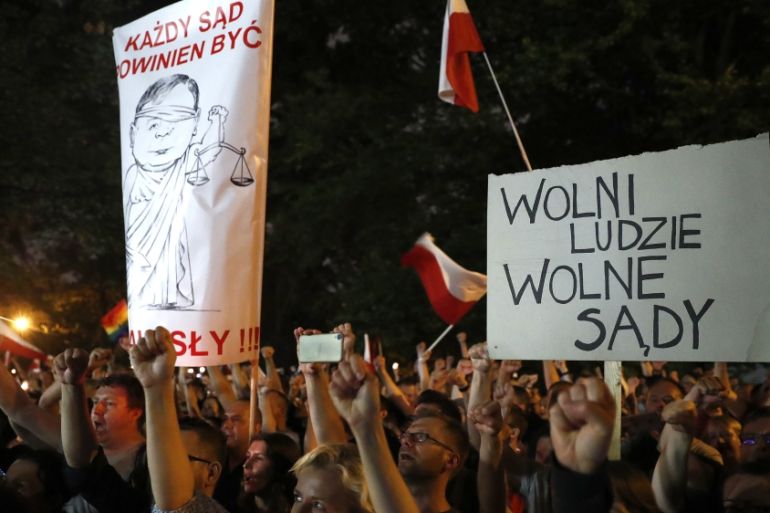 In the same vein, PiS coming to power was “a victory” of the Polish nation against its oppressors – communists, liberals, leftists (all of them mashed together) and their Western allies. It’s a reading of reality that has been built up meticulously, using historical denialism and symbolic rituals, with the help of Poland’s prodigious right-wing media and part of the powerful Catholic Church. It gives grounds for PiS to implement regime change – get rid of liberal democracy in the name of the Polish nation.