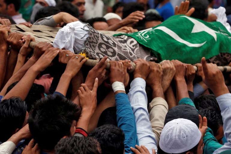People in the village of Gabarpora carry the remains of Akeel Ahmad Bhat, a civilian who died following clashes between Kashmiri fighters and Indian security forces [Danish Ismail/Reuters]