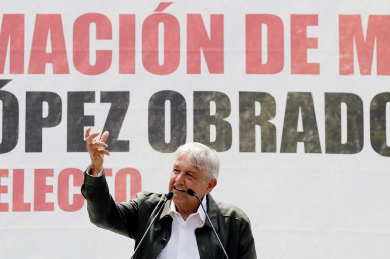 Lopez Obrador, who is known by the acronym AMLO, was once a confrontational left-wing candidate. Ever since his latest presidential campaign began, however, he has become a friend to all. Harmony and unity, peace and love were the buzzwords of his campaign. While he claimed his administration would represent the people in power and end three decades of neoliberalism, at every step he reassured Mexico’s elite sectors that they had nothing to fear. There would be no expropriations or nationalisations, he said. Taxes would not be raised and tax-free zones would be created to encourage investment.