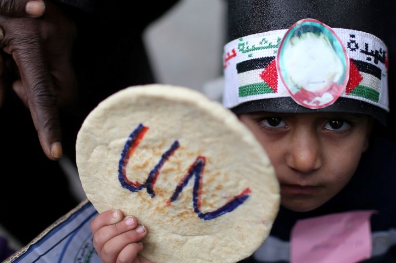 A Palestinian child holds bread during a protest against aid cuts, outside the United Nations' offices in Khan Younis in the southern Gaza Strip on January 28, 2018 [Reuters/Ibraheem Abu Mustafa]