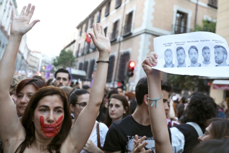 Protests were held across Spain after five men accused of the gang rape of a teenager in Pamplona were found guilty of the lesser offence of sexual abuse [Reuters]