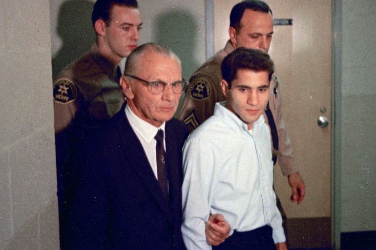 ![Two sons, Munir and Adel, accompany Mary Sirhan to a session of the trial of Sirhan Sirhan in Los Angeles for the murder of Robert F Kennedy on January 8, 1969 [File photo: David F Smith/AP]](https://www.aljazeera.com/wp-content/uploads/2018/06/9c2af42a011f43ea976b58a1ca6392cf_18.jpeg?quality=80)
