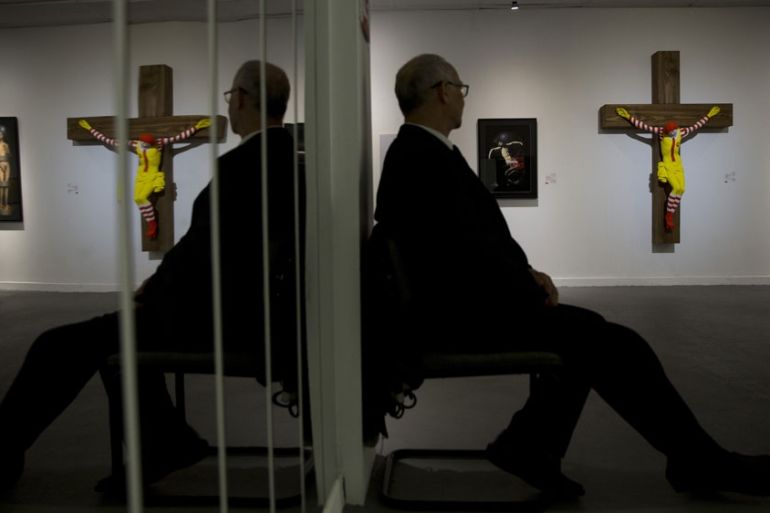 Hundreds of Palestinian Muslims and Christians descended on the Haifa Museum of Art last Friday to protest the display of various artworks that use mass culture merchandise and corporate mascots to depict Christian icons. An online petition has also been launched to demand the removal of Finnish artist Jani Leinonen’s artworks, which included a crucified Ronald McDonald and Mattel dolls – Ken and Barbie – representing Jesus Christ and Virgin Mary.