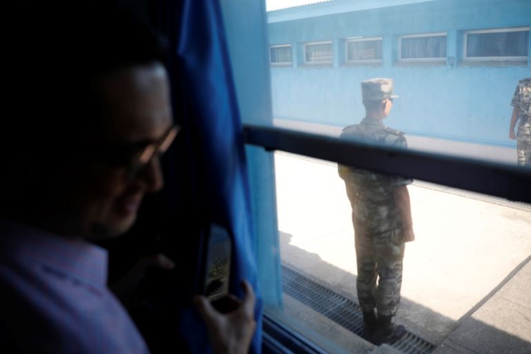 A monument encircled by South Korean and American flags paid humble tribute to the sacrifice of America’s sons while nearby billboards advertised K-beauty products, whose exports amount to $3.6bn a year. The gun keychains sold in the many kiosks do not exactly scream “peace park” but we move on, crossing Freedom Bridge – also called Cow Bridge because the founder of Hyundai, who had North Korean origins, sent 1,001 cows over the bridge as a gesture of goodwill to his former homeland – before we were stopped at what Soo called a “checking point”.