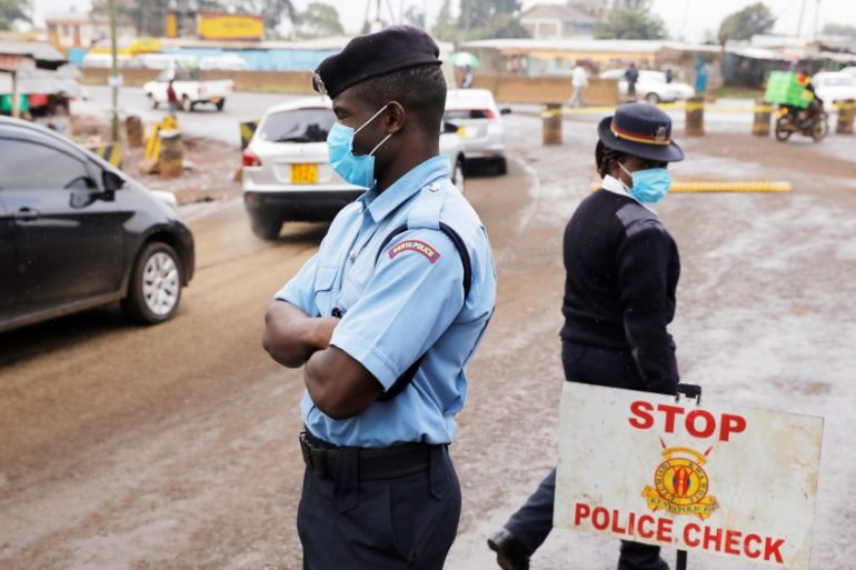 Kenyan police officers check vehicles at a roadblock to control traffic coming into Nairobi during a partial lockdown on April 7, 2020 [Reuters/Baz Ratner]