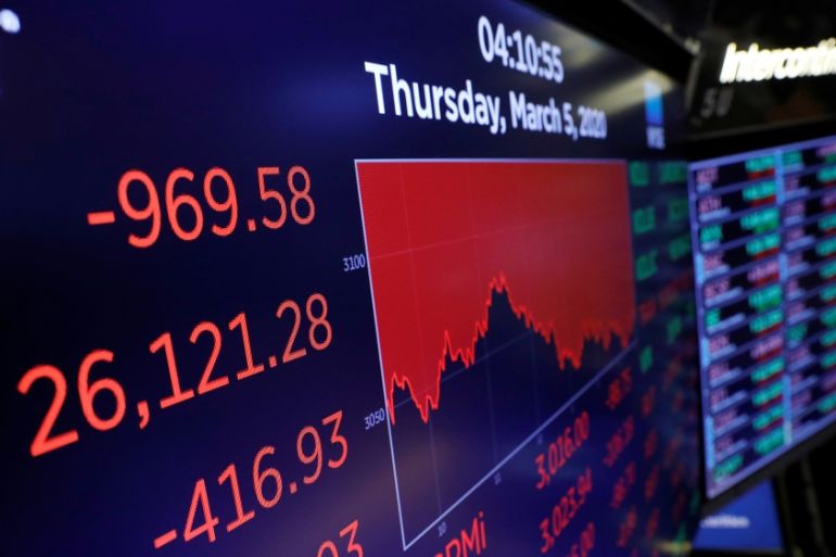 ![The Dow Jones Industrial Average is displayed after the closing bell on the floor of the New York Stock Exchange (NYSE) in New York City [Andrew Kelly/Reuters]](https://www.aljazeera.com/wp-content/uploads/2020/04/e756f9c859d445b3bd20a306c6d096ce_18.jpeg?resize=770%2C513&quality=80)