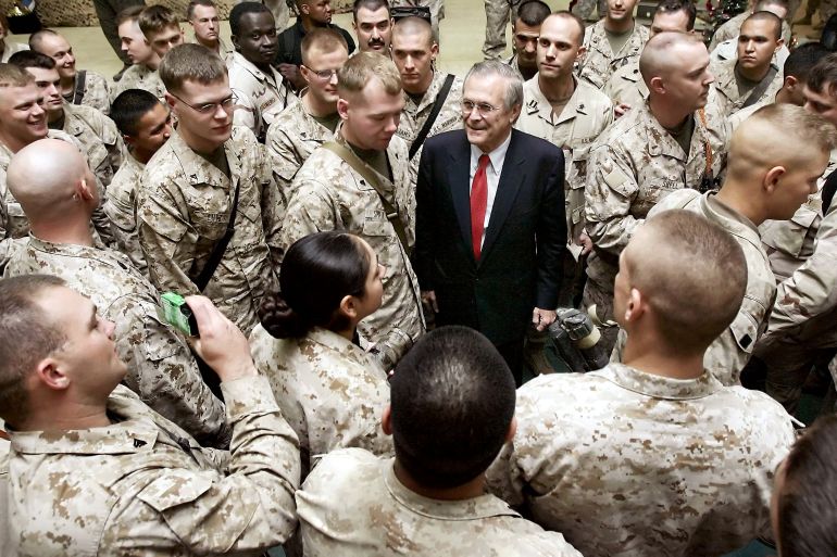 In Rumsfeld’s warped geopolitical calculus, the US was the benevolent Globo-cop and he, the happy warrior in a crisp suit and tie, envisioned a world – particularly in the Middle East and Afghanistan – that resembled the mythic, made-in-America ideal of democracy and plurality.