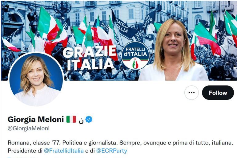 On her Twitter profile, Meloni has added the Arabic letter nuun (ن), which in 2014 became a symbol of solidarity with Christian victims of the armed group ISIL (ISIS) as it took over the Iraqi city of Mosul and ethnically cleansed it of one of the oldest Christian communities in the world. The group would mark Christian homes with that letter to make it easier to target them. They did so with the first letter of the word Nasrani, or Nazarene, one of the words for Christian in Arabic which references Jesus’ childhood home of Nazareth. It is perceived as derogatory by some Arab Christians.
