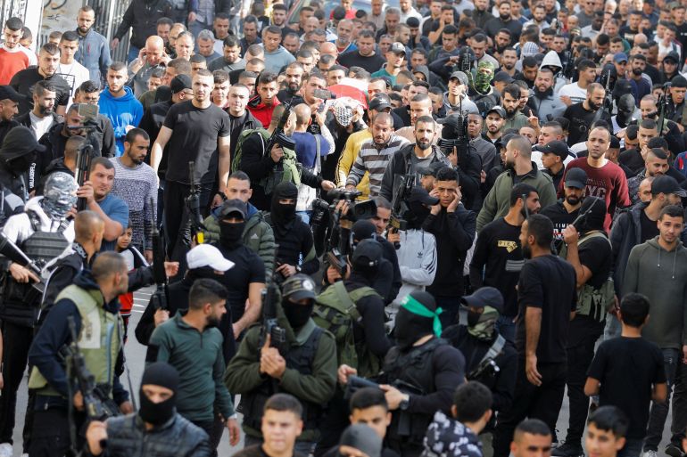 Mahmoud’s body – wrapped in a Palestinian flag – was carried aloft on an orange stretcher through the streets of Jenin, followed by a throng of chanting mourners.