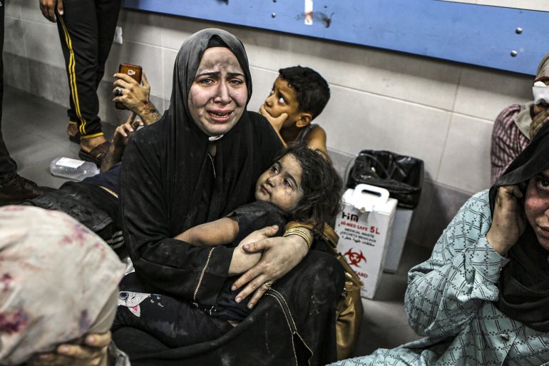 ![Palestinians wounded at al-Ahli hospital in Gaza sit on the floor at al-Shifa hospital following a deadly air strike blamed on Israel [Abed Khaled/AP]](https://www.aljazeera.com/wp-content/uploads/2023/10/AP23290670138826-1697581240-e1697612165453.jpg?resize=770%2C513&quality=80)