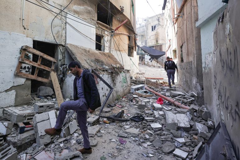 ![Men walk amid the debris of damaged buildings following an overnight Israeli incursion in the occupied West Bank city of Jenin. [Zain Jaafar/AFP]](https://www.aljazeera.com/wp-content/uploads/2023/11/344X7KM-highres-1701026308.jpg?resize=770%2C513&quality=80)