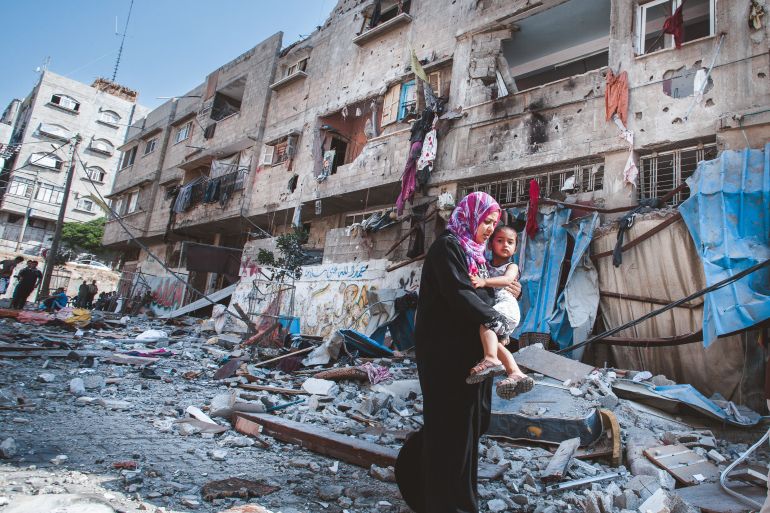 ![A Palestinian mother holds her son while passing a severely damaged residential building that was destroyed overnight by an Israeli airstrike at Al Sheikh Redwan in Gaza City on July 10, 2014 [Courtesy of Eman Mohammed]](https://www.aljazeera.com/wp-content/uploads/2023/12/GZ-EM02-1701607281.jpg?resize=770%2C513&quality=80)