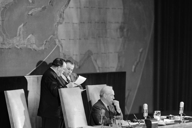 On the eve of the vote, Iraq’s foreign minister, Fadhel al-Jamali, a signatory of the charter, declared before the General Assembly: “Partition imposed against the will of the majority of the people will jeopardise peace and harmony in the Middle East. Not only the uprising of the Arabs of Palestine is to be expected, but the masses in the Arab world cannot be restrained. The Arab-Jewish relationship in the Arab world will greatly deteriorate. There are more Jews in the Arab world outside of Palestine than there are in Palestine. … In short, whoever thinks that the partition of Palestine will settle the problem of Palestine is mistaken. Partition will create a dozen new problems dangerous to peace and international relations. It is much better to let Palestine alone than to attempt to enforce a solution which will bear bitter fruit.”