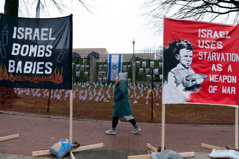 In addition to Palestinian flags, other visuals lining the street included invitations to “Honk 4 Palestine”, pictures of bloodied Palestinian babies and other carnage in Gaza, and a reminder of Israel’s use of starvation as a weapon of war. A faux street sign read: “Genocide Street Northwest”. Directly in front of the embassy was a memorial to Aaron Bushnell, the 25-year-old active duty member of the US Air Force who self-immolated outside the compound on February 25 in what he warned was an “extreme act of protest – but compared to what people have been experiencing in Palestine at the hands of their colonisers is not extreme at all”.