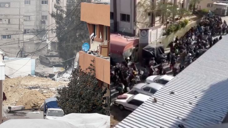 Dozens of Palestinians have been filmed leaving Nasser Hospital in Khan Younis after Israeli forces ordered the evacuation of everyone in the complex. Witnesses say Israeli snipers had been firing on anyone who moved in the area and several people have been killed near the hospital.