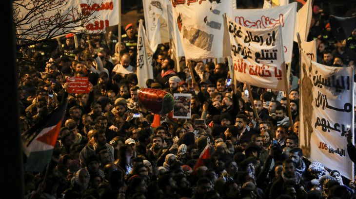 Thousands of pro-Palestinian protesters gathered outside the Israeli embassy in Jordan’s capital for a second day, demanding an end to Jordan’s peace agreement with Israel. Security forces broke up demonstrations with tear gas and arrests, leaving several people injured.